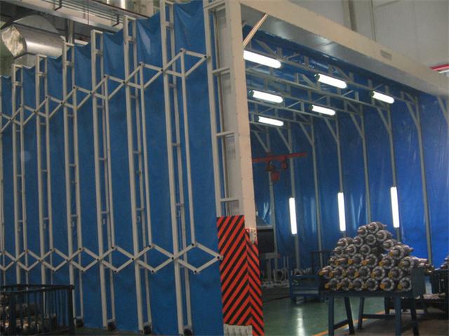 伸縮噴漆房通常采用多組可移動(dòng)的框架有成平行四邊形狀的連桿連接而成,再點(diǎn)擊的驅(qū)動(dòng)下帶動(dòng)整個(gè)前室伸縮移動(dòng),框架之間由阻燃PVC布密封,行程一個(gè)隔離的獨(dú)立工作間,避免噴漆工作的車間環(huán)境污染。