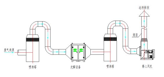 制藥廢氣處理考慮運(yùn)營(yíng)成本及安全性,本方案工藝路線擬定采用“通風(fēng)系統(tǒng)(風(fēng)機(jī)、收集罩、管道)+預(yù)處理系統(tǒng)(水洗塔)+核心凈化系統(tǒng)(UV光解凈化設(shè)備)+后處理系統(tǒng)(堿淋塔)”來(lái)進(jìn)行制藥廢氣處理。工藝設(shè)備圖如下: