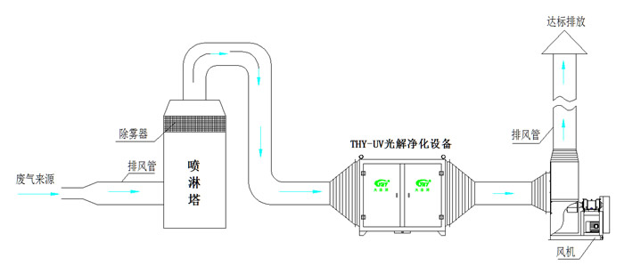 第一階段:廢氣經過一級水噴淋對廢氣中氨、醇等易溶于水的成分以及灰塵進行去除預處理,再進入下一道工序。